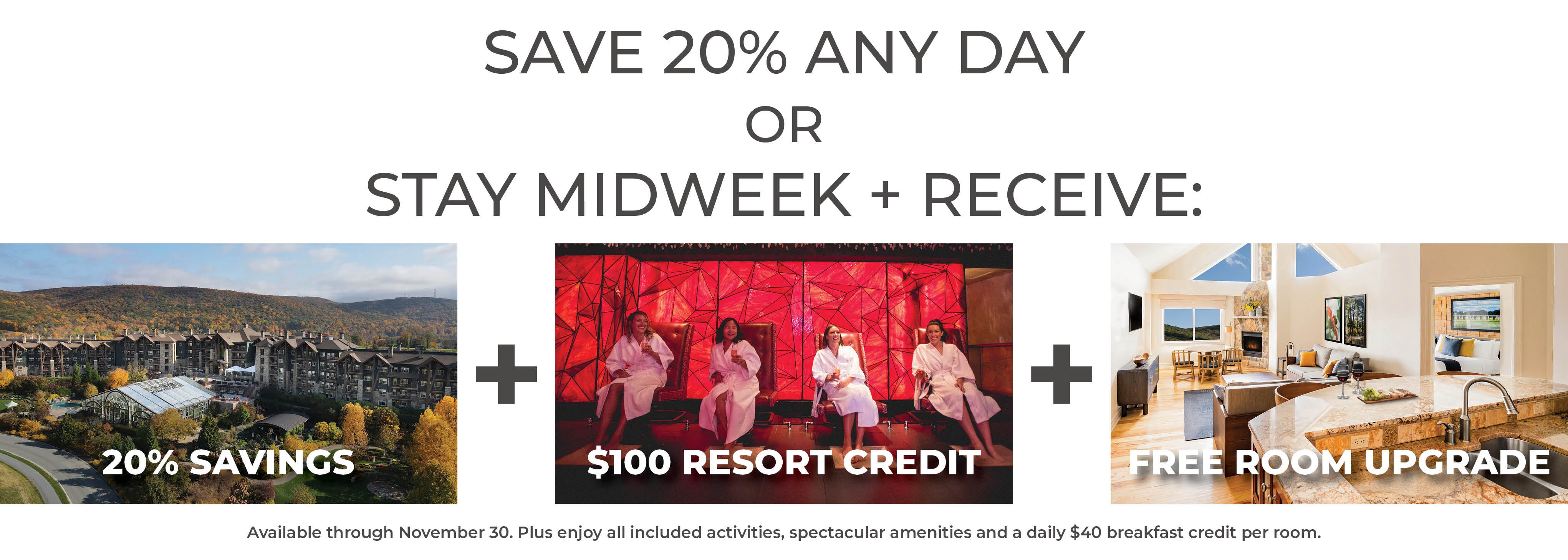 For a limited time, elevate your autumn getaway with 3 Extraordinary Bonuses: a generous hotel discount, resort credit plus hotel room upgrade. It's the perfect way to enjoy an amazing fall escape for less.