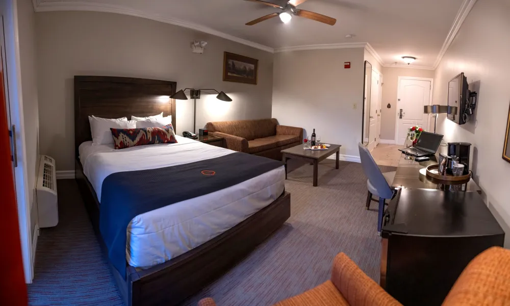 Deluxe Studio Guest Rooms each feature one queen-size bed and a convenient sleeper sofa. Upscale, Aspen-themed decor sets the tone, and you’ll enjoy high-speed Internet access, a TV with in-room movies, a mini fridge, a clock radio, in-room safe, iron and ironing board; hair dryer, and telephone with dataport, voicemail, and messaging system. Some Deluxe Studio Guest Rooms connect to Luxury Guest Rooms and are available for an additional fee.