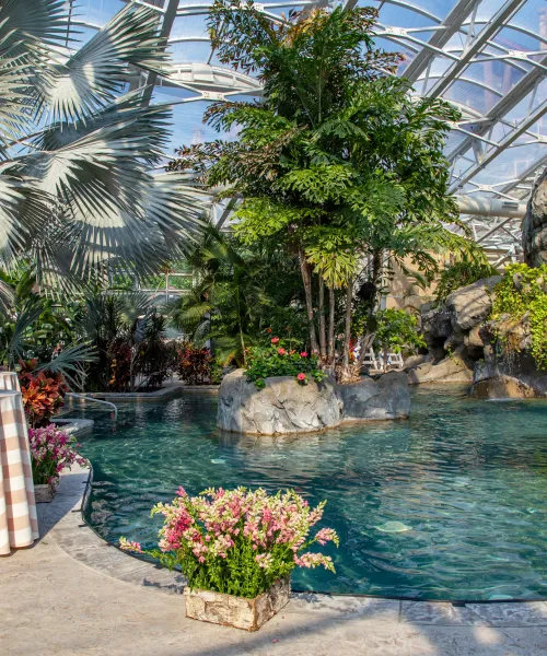 This unique tropical venue offers a large inviting pool with 140 ft. slide, an underwater aquarium surrounded by lush foliage, grotto-like hot tub and a roof allowing for year-round sun tanning. The Biosphere can accommodate a one-of-a-kind reception for up to 300 persons or a themed after party providing a fun opportunity for your group to relax and connect. Sq. ft. 10,000.