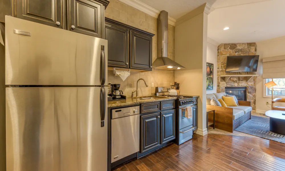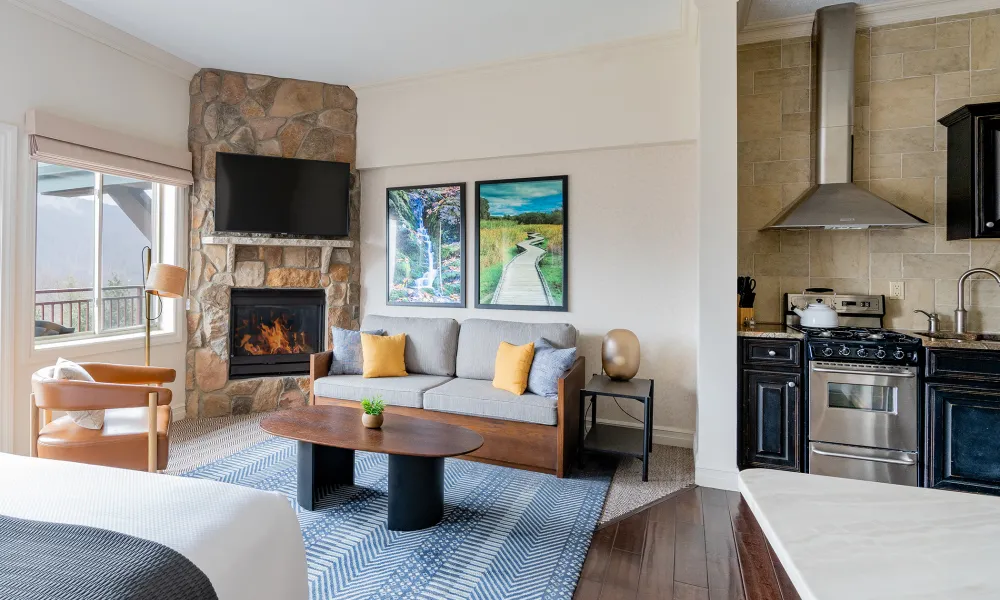 Studio Suites each feature a king size bed, a sleeper sofa, gas fireplace and balcony/patio with inspiring views. You’ll enjoy all the comforts of home, with a dining area, fully equipped gourmet kitchen, and in-unit laundry. Keep yourself entertained with a flat-panel TV with cable and in-room movies, stay productive with a work desk and high-speed Internet access and unwind with a luxurious shower and tub.