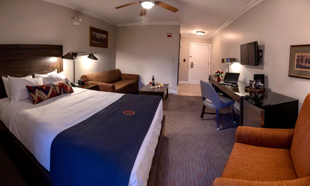 Deluxe Studio Guest Rooms each feature one queen-size bed and a convenient sleeper sofa. Upscale, Aspen-themed decor sets the tone, and you’ll enjoy high-speed Internet access, a TV with in-room movies, a mini fridge, a clock radio, in-room safe, iron and ironing board; hair dryer, and telephone with dataport, voicemail, and messaging system. Some Deluxe Studio Guest Rooms connect to Luxury Guest Rooms and are available for an additional fee.