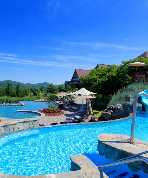 Featuring two amazing pools, the Vista 180° complex is the perfect warm weather retreat. The refreshing infinity pool offers breathtaking views of the surrounding mountains. The adjacent freeform pool features a fun waterslide, unique current vortex pool plus a therapy-jet spa cove.